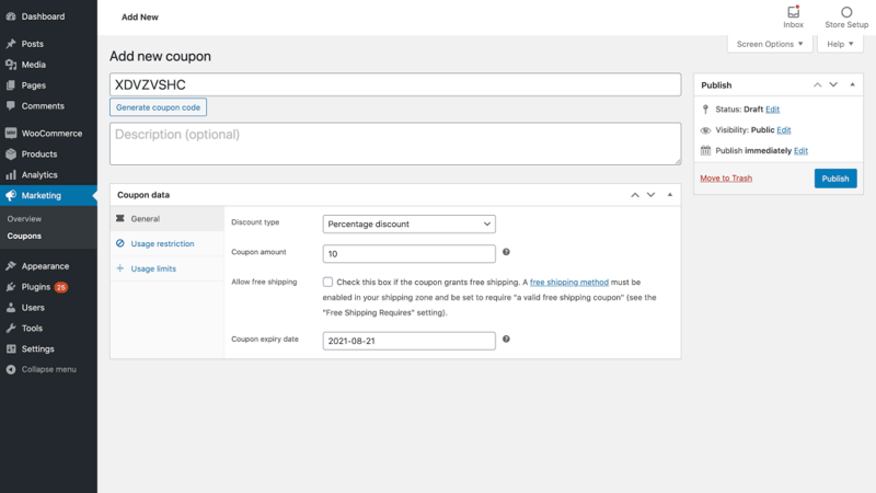 You can tell WooCommerce to generate a code automatically, by selecting Generate coupon code. WooCommerce will then create a long, complex code consisting of random characters. This can make it more difficult for customers to guess your coupons: